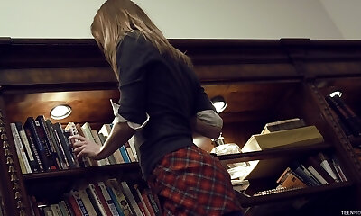 Nerdy librarian in glasses Zena Little is having quickie with one of college girls