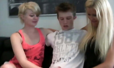 une étudiante reçoit une branlette surprise chanceuse de la part d'une tutrice blonde chaude cfnm