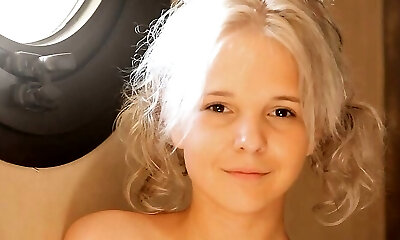 blondinette à l'air mielleux en bas laiteux nikki fantasy s'amuse avec sa chatte en plein air